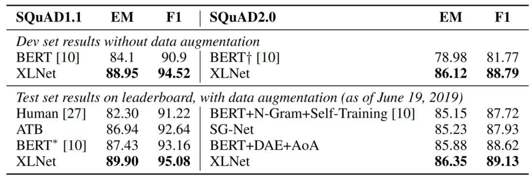 于是,我们来到了 SQuAD 阅读理解数据集,这是由 SQuAD1.1 和更具难度的 SQuAD2.0 组成的双重关卡。XLNet 在 RACE 上就已经取得很好的成绩了,相信它在更简单的 SQuAD 上也不成问题,果然, XLNet 一个平螺旋,刷刷,连续绕过了 SQuAD1.1 和 SQuAD2.0,在后者上甚至直接甩了 BERT 近7个点!!!
