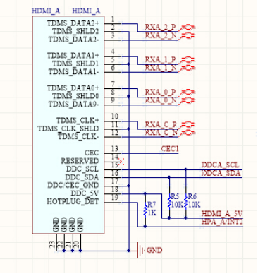上图是HDMI显示器的接口电路。当显示器和主机连接时,主机供电给显示器的18pin——HDMI_A_5V,此时该引脚有5V电压。HPA_A/INT2要分两种情况讨论: