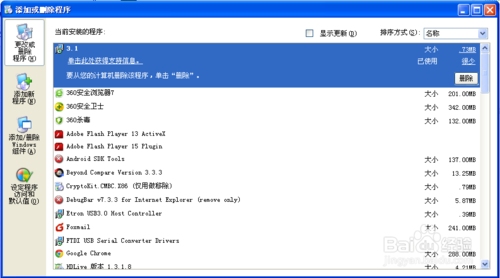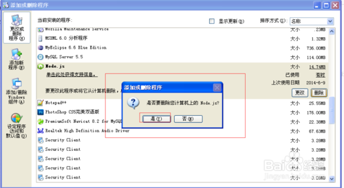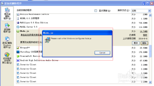 在弹出“添加或删除程序”框中找到要卸载的程序,比如Node.js,鼠标单击改行,点击右边的“删除”按钮。