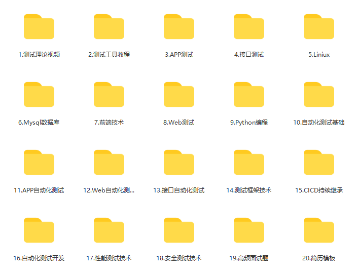 这些对想从事【软件测试】的朋友来说应该是最全面最完整的备战仓库,这个仓库也陪伴我走过了最艰难的路程,希望也能帮助到你!凡事要趁早,特别是技术行业,一定要提升技术功底。希望对大家有所帮助……基础知识、Linux必备、Shell、互联网程序原理、Mysql数据库、抓包工具专题、接口测试工具、测试进阶-Python编程、Web自动化测试、APP自动化测试、接口自动化测试、测试高级持续集成、测试架构开发测试框架、性能测试、安全测试等配套学习资源免费分享~
