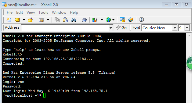 [root@localhost Server]# telnet 127.0.0.1 Trying 127.0.0.1... Connected to localhost.localdomain (127.0.0.1). Escape character is '^]'. Red Hat Enterprise Linux Server release 5.5 (Tikanga) Kernel 2.6.18-194.el5 on an x86_64 login: vnc Password: Last login: Wed May 6 17:59:20 on :0 [vnc@localhost ~]$ su 口令: [root@localhost vnc]# exit exit [vnc@localhost ~]$ exit logout Connection closed by foreign host. [root@localhost Server]#