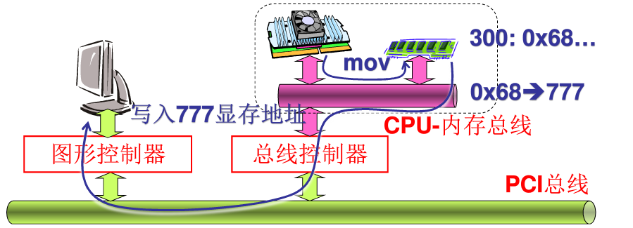 - CPU发一些指令给内存,将内存地址为300的内容取出来放在777的显存地址上;