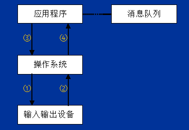 向上的箭头④表示操作系统能够将输入设备的变化上传给应用程序。如用户在某个程序活动时按了一下键盘,操作系统马上能够感知到这一事件,并且能够知道用户按下的是哪一个键,操作系统并不决定对这一事件如何作出反应,而是将这一事件转交给应用程序,由应用程序决定如何对这一事件作出反应。好比有个蚊子叮了我们一口,我们的神经末梢(相当于操作系统)马上感知到这一事件,并传递给了我们的大脑(相当于应用程序),我们的大脑最终决定如何对这一事件作出反应,如将蚊子赶走,或是将蚊子拍死。对事件作出反应的过程就是消息响应。