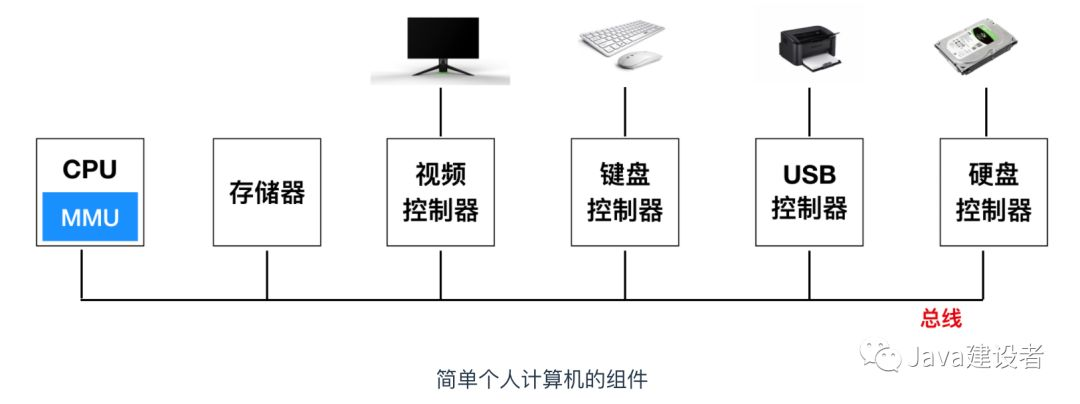 从概念上来看,一台简单的个人电脑可以被抽象为上面这种相似的模型,CPU、内存、I/O 设备都和总线串联起来并通过总线与其他设备进行通信。现代操作系统有着更为复杂的结构,会设计很多条总线,我们稍后会看到。暂时来讲,这个模型能够满足我们的讨论。