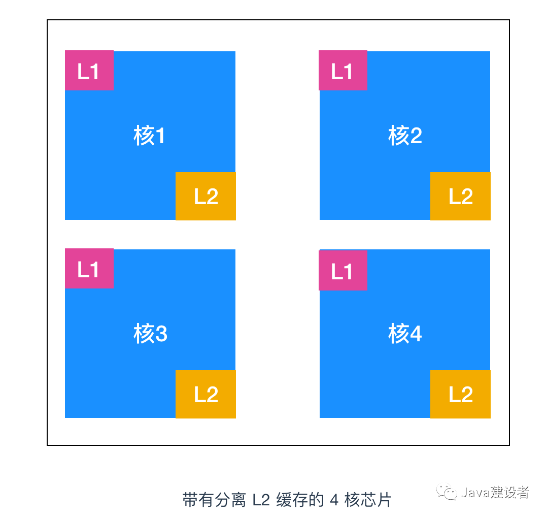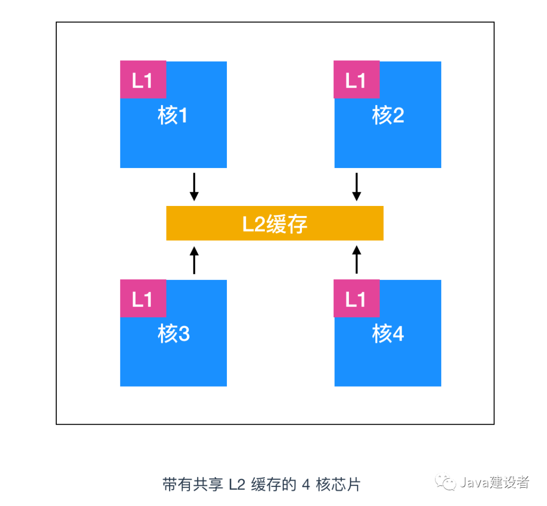 缓存是解决问题的一种好的方式,所以现代 CPU 设计了两种缓存。第一级缓存或者说是 L1 cache 总是位于 CPU 内部,用来将已解码的指令调入 CPU 的执行引擎。对于那些频繁使用的关键字,多数芯片有第二个 L1 cache 。典型的 L1 cache 的大小为 16 KB。另外,往往还设有二级缓存,也就是 L2 cache,用来存放最近使用过的关键字,一般是兆字节为单位。L1 cache 和 L2 cache 最大的不同在于是否存在延迟。访问 L1 cache 没有任何的延迟,然而访问 L2 cache 会有 1 - 2 个时钟周期的延后。