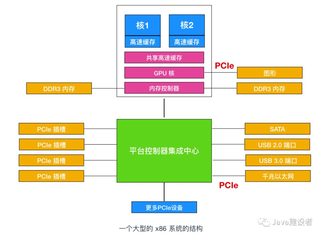 在上图结构中,CPU 通过 DDR3 总线与内存对话,通过 PCIe 总线与外围图形设备 (GPU)对话,通过 DMI(Direct Media Interface)总线经集成中心与所有其他设备对话。而集成控制中心通过串行总线与 USB 设备对话,通过 SATA 总线与硬盘和 DVD 驱动器对话,通过 PCIe 传输以太网络帧。