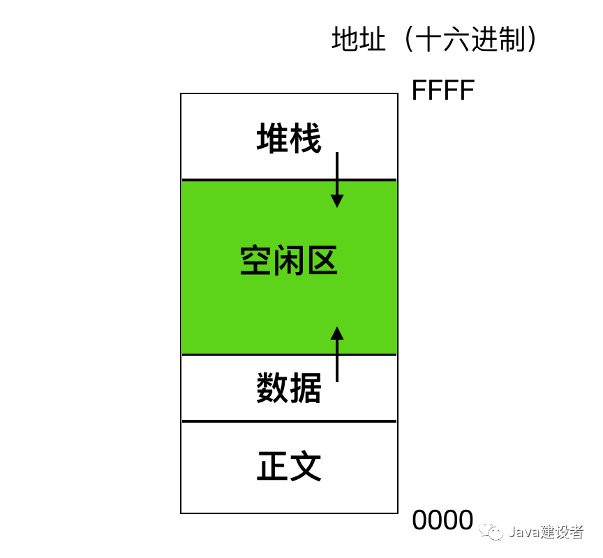 UNIX 中的进程将内存划分成三个部分:text segment,文本区,例如程序代码,data segment,数据区,例如变量,stack segment,栈区域。数据向上增长而堆栈向下增长,如下图所示