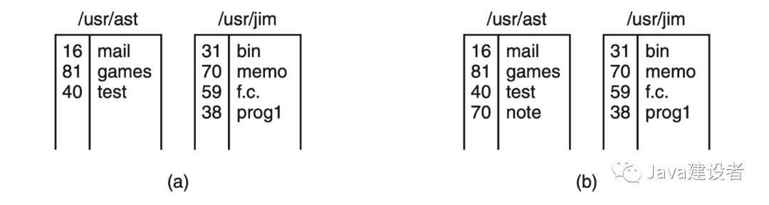 jim 中的 memo 文件现在会进入到 ast 的目录中,在 note 名称下。此后,/usr/jim/memo和 /usr/ast/note 会有相同的名称。