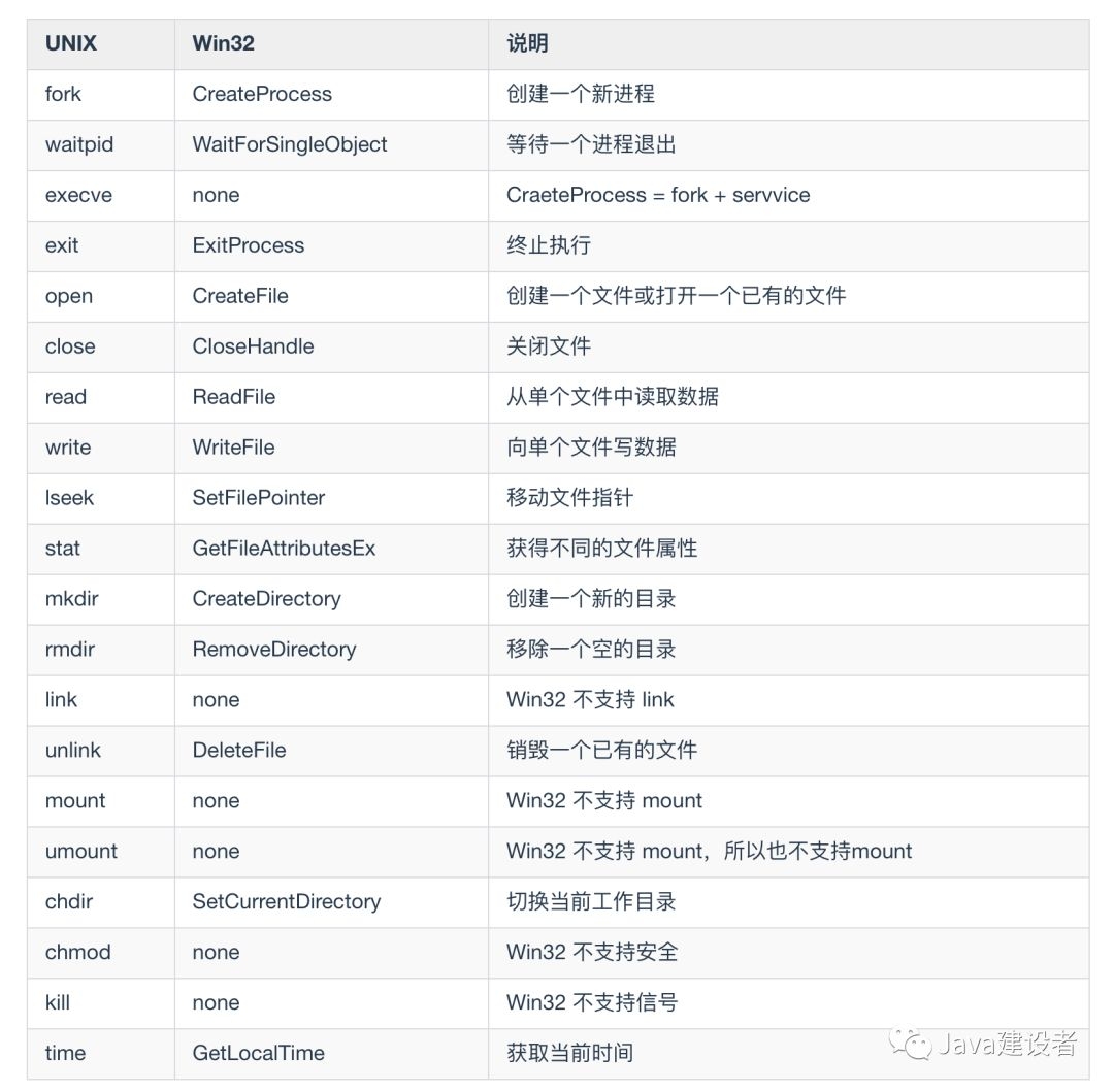 Win32 接口中没有文件的链接、文件系统的 mount、umount 和 stat ,当然, Win32 中也有大量 UNIX 中没有的系统调用,特别是对 GUI 的管理和调用。