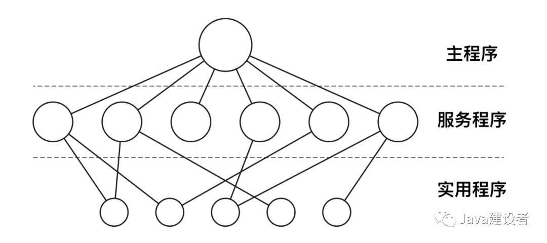 在单体系统中,对于每个系统调用都会有一个服务程序来保障和运行。需要一组实用程序来弥补服务程序需要的功能,例如从用户程序中获取数据。可将各种过程划分为一个三层模型