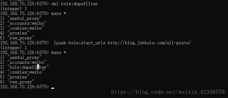 7>所有爬虫都启动之后,部署redis-server服务的电脑,通过命令redis-cli lpush jobbole:start_urls http://blog.jobbole.com/all-posts/向redis的queue中添加起始的url