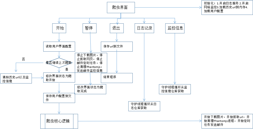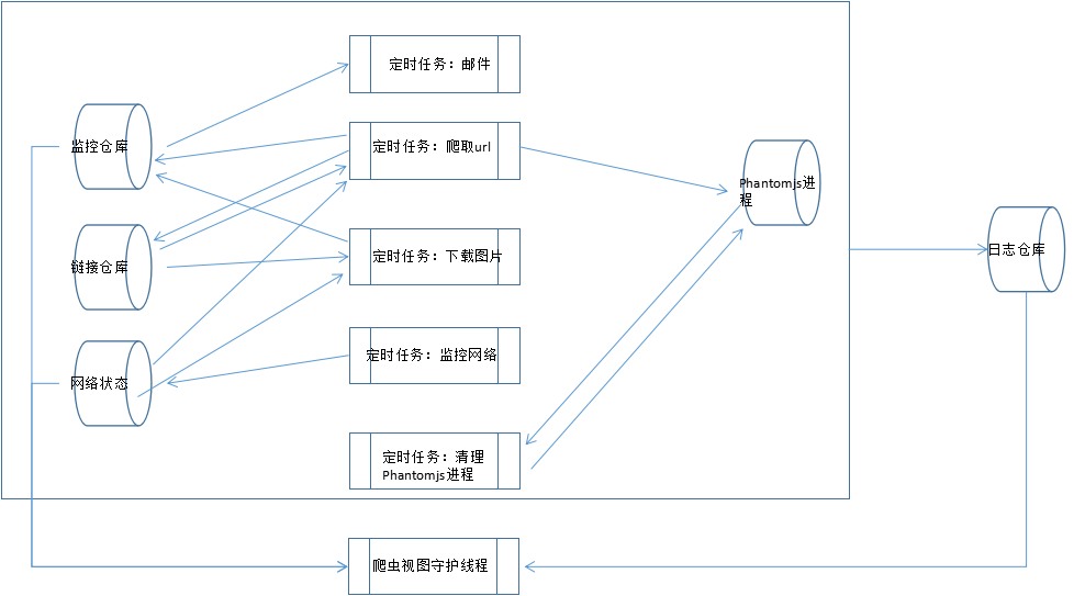 包含定时抓取维护url和定时下载图片以及附加功能(监控网络、日志打印、监控爬虫进度、邮件提醒等),两者功能进行了分离,数据共享。