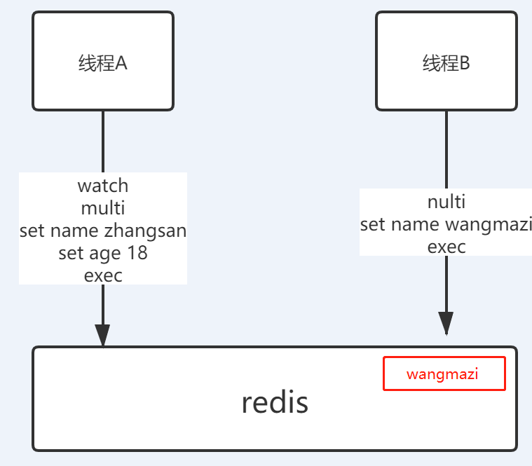 执行步骤:还是和上面一样,不过,线程A再开启事务之前,先开启了watch监听,然后还是和上面一样的执行步骤