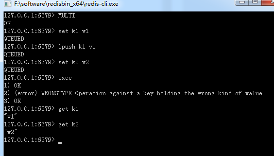 而对于“调用EXEC之后的错误”(入队成功,执行出错),redis则采取了完全不同的策略,即redis不会理睬这些错误,而是继续向下执行事务中的其他命令。这是因为,对于应用层面的错误,并不是redis自身需要考虑和处理的问题,所以一个事务中如果某一条命令执行失败,并不会影响接下来的其他命令的执行。