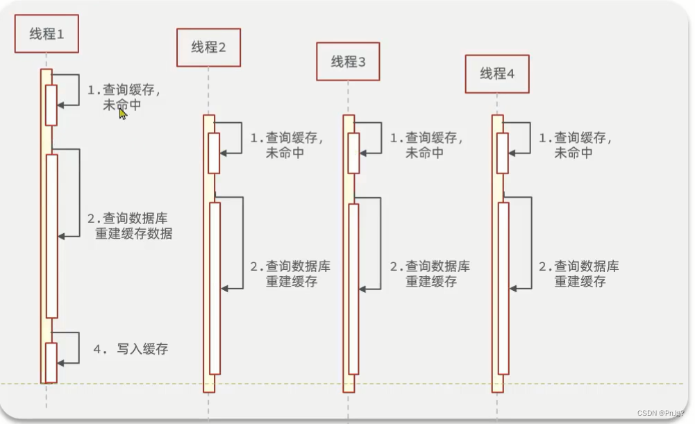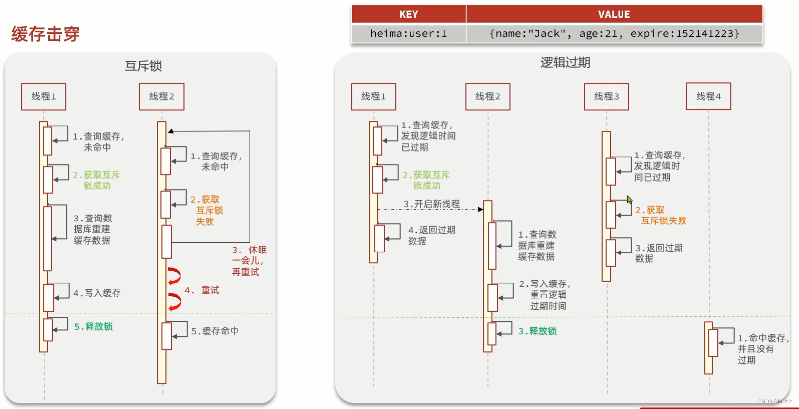 缓存击穿问题也叫热点key问题,就是一个被高并发访问并且缓存重建业务较复杂的key突然失效了,无数的请求访问会在瞬间给数据库带来巨大的冲击。