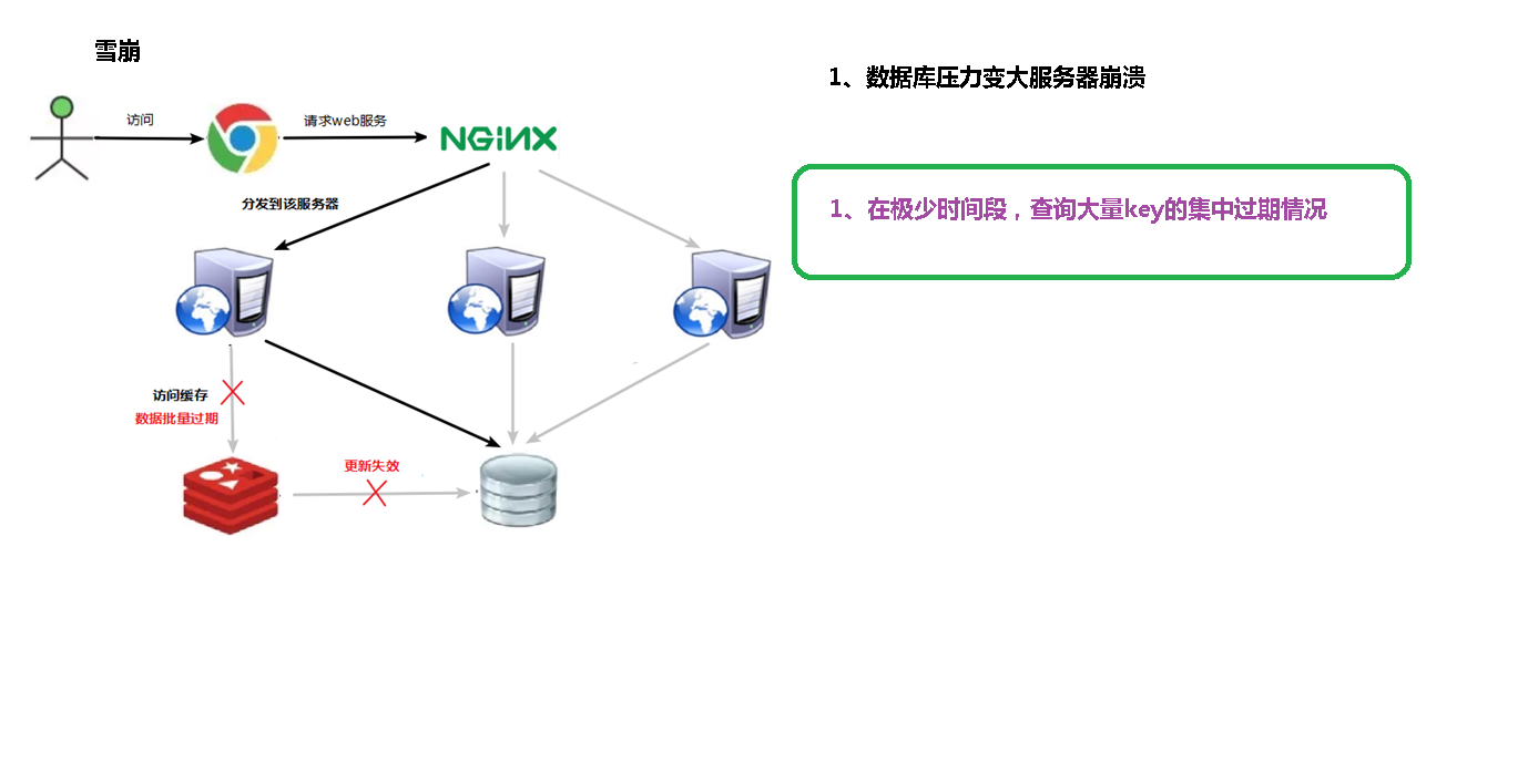 缓存雪崩发生是说:当我们访问多个key对应的数据时,这些key在redis中都过期(无法获取)了,那么这些大量的高并发请求就会转到后端DB中去查找访问,进而造成了数据库的崩溃现象。