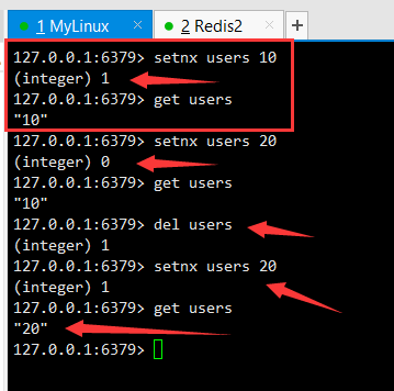 下面的截图案例:首先redis中没有users这个key,我们使用 setnx 对这个key进行加锁操作,值为10;之后我们尝试再次setnx,可以看到返回值是0,说明此时不能再修改users的值,也就是说之前操作对users加了锁,其他人就无法操作users,只能等待释放users的锁,也就是del命令。这里del users释放了锁之后,就可以再次对users加锁操作了。