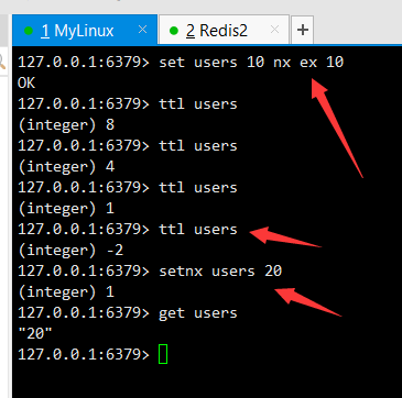 这里我们使用 set users 10 nx ex 10 来对users上锁,上锁的同时设置它的过期时间为10s。