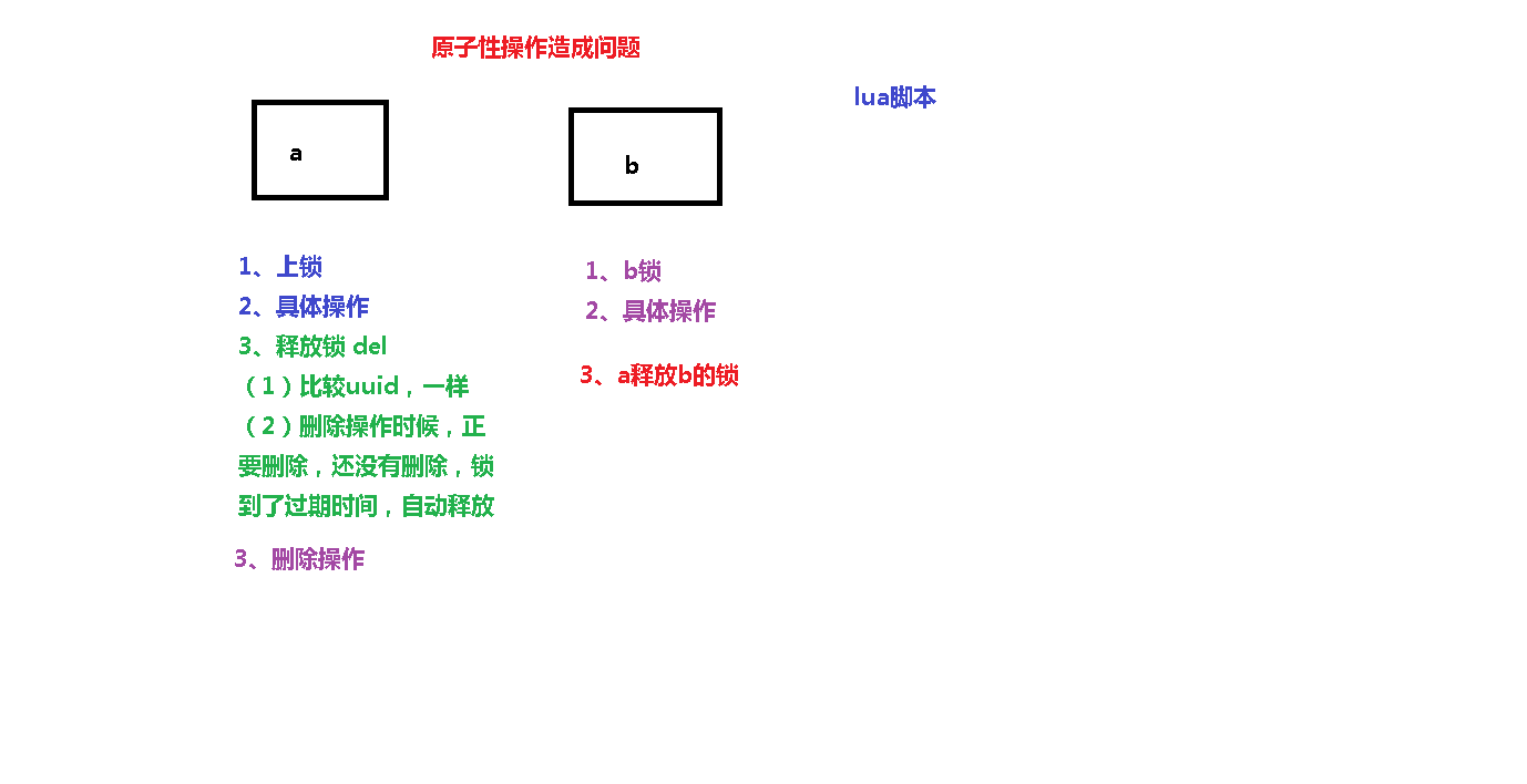 此时有a、b两个操作,a先对users上了锁,执行它的业务逻辑,执行完毕之后,a执行释放锁操作,在这个期间发生了问题:首先比较uuid是否一样,比较完一样证明这是自己的锁,而正要释放删除锁的时候(此时还未删除),锁到达了过期时间、自动释放了。。。此时b就获取到了锁,执行b的业务逻辑。因为之前a的删除锁操作并未做完,所以此时a仍然会执行锁的删除操作,那么自然而然就把b上的锁给删除了。(疑问:a为何能删除b的锁呢?不是已经添加了uuid吗? 这里注意:a在执行删除锁操作时,已经进行了uuid比较,比较结果是一样证明是自己的锁;那么b此时获取的这个锁就是a的锁,当然可以删!!!)