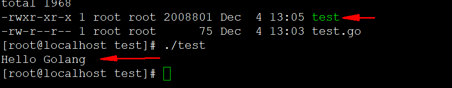 6.然后执行"go build test.go",该目录下会生成一个test文件,使用"./test"命令运行,输出Hello Golang说明成功