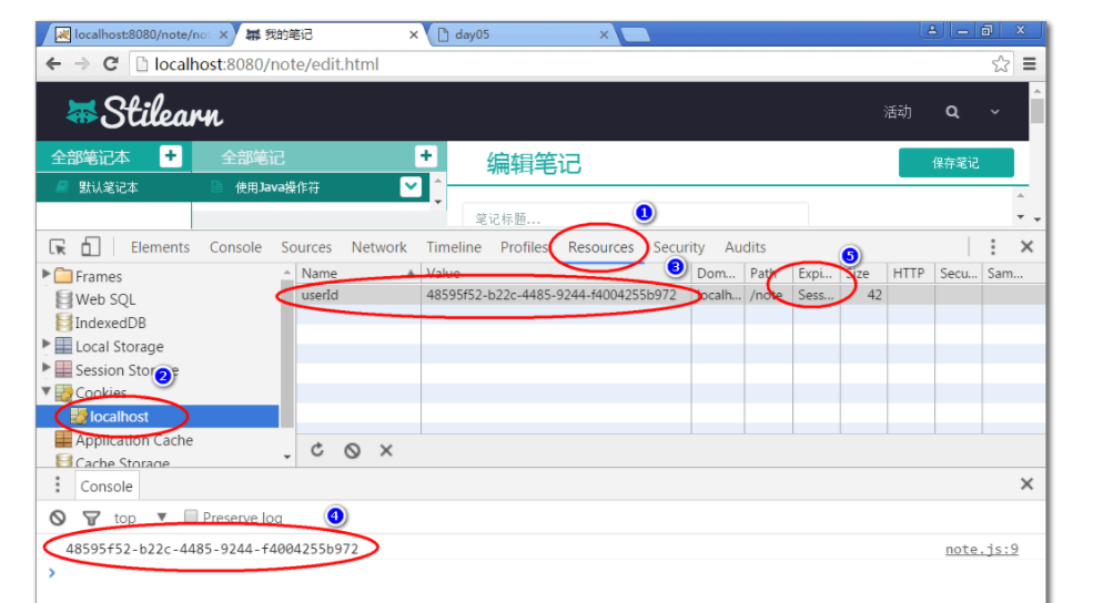 测试: 登录以后可以再edit.html 的控制台上能够看到 userId, 可以通过浏览器的控制台检查cookie保存情况:
