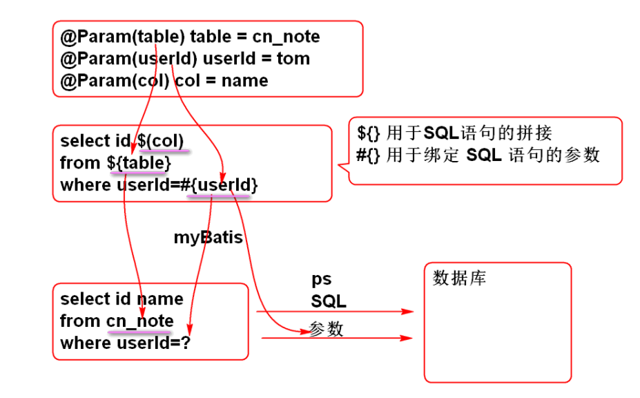 ${} 用于进行动态SQL拼接, 仅仅是拼接SQL语句, 有SQL注入风险, 不要将用户输入的 参数 利用 ${} 进行拼接