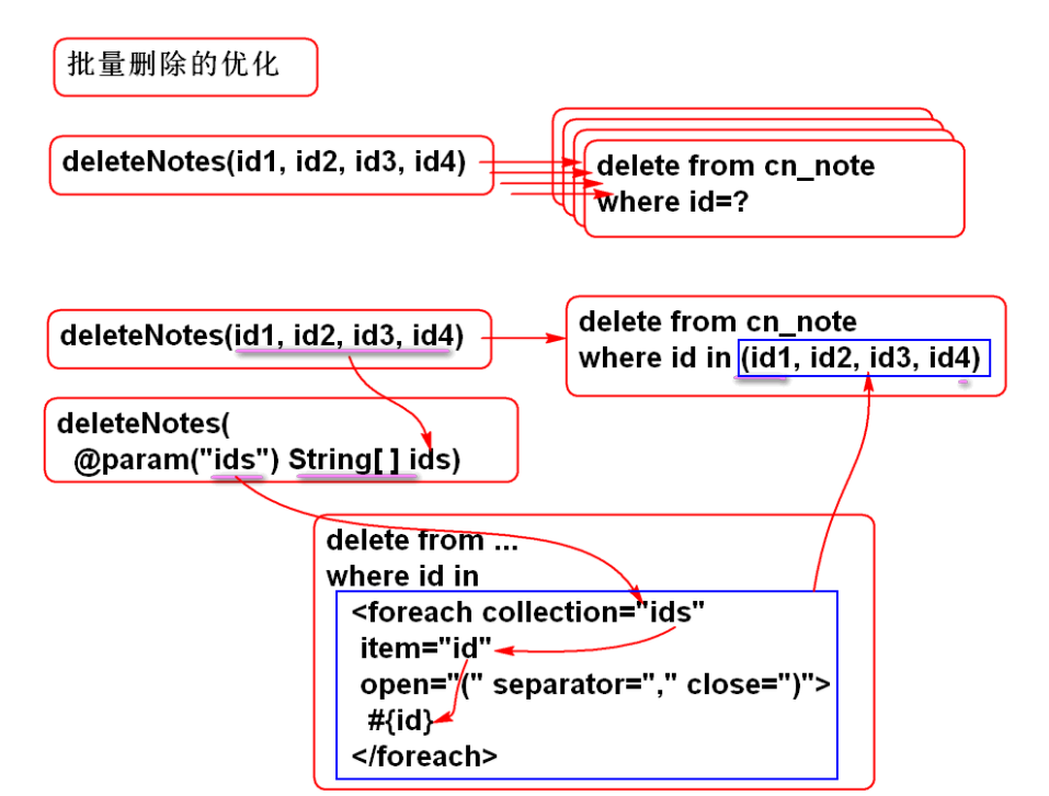 <delete id="deleteNotes"> delete from cn_note where cn_note_id in <foreach collection="ids" item="id" open="(" separator="," close=")"> #{id} </foreach> </delete> -