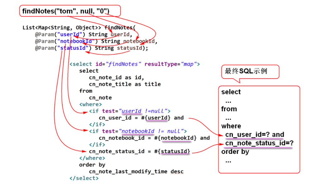 <select id="findNotebooksByPage" resultType="map"> select cn_notebook_id as id, cn_notebook_name as name from ${table} where cn_user_id = #{userId} order by cn_notebook_createtime desc limit #{start}, #{pageSize} </select>${table} 可以替换SQL语句的表名, 实现动态SQL拼接查询, 尽量不要用于参数部分, 否则可能有SQL注入风险.