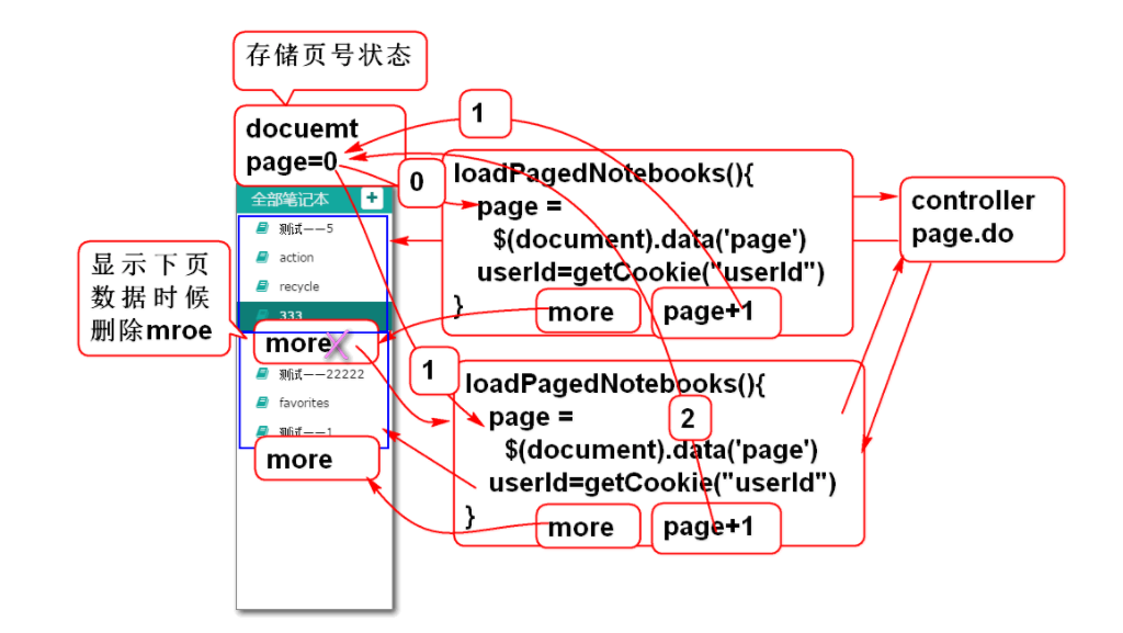 //在document对象中存翻页页号状态 $(document).data('page',0); //加载第一页数据 loadPagedNotebooks(); //点击more时候加载下一页数据 $('#notebook-list').on( 'click','.more', loadPagedNotebooks); -