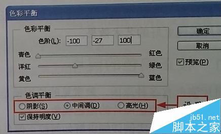 6、再次选择“图像”“调整”“色彩平衡”命令,弹出“色彩平衡”对话框,设置参数。