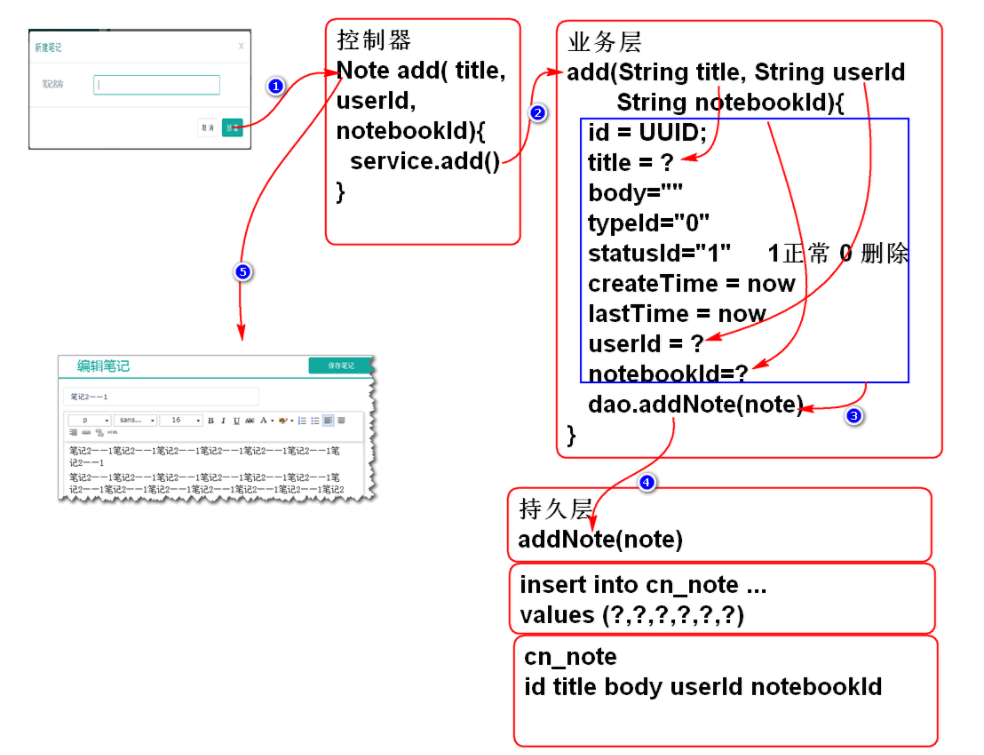public Note addNote(String userId, String notebookId, String title) throws UserNotFoundException, NotebookNotFoundException;提示: 方法的三个参数是根据对业务规程分析来确定的.