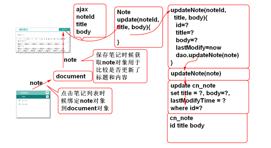 <!-- NoteMapper.xml --> <update id="updateNote" parameterType="cn.tedu.note.entity.Note"> update cn_note set <if test="notebookId!=null"> cn_notebook_id=#{notebookId}, </if> <if test="userId!=null"> cn_user_id=#{userId}, </if> <if test="statusId!=null"> cn_note_status_id=#{statusId}, </if> <if test="typeId!=null"> cn_note_type_id=#{typeId}, </if> <if test="title!=null"> cn_note_title=#{title}, </if> <if test="body!=null"> cn_note_body=#{body}, </if> cn_note_last_modify_time=#{lastModifyTime} where cn_note_id=#{id} </update>MyBatis 的 if 标签可以动态生成SQL, 这里可以实现部分属性更新功能