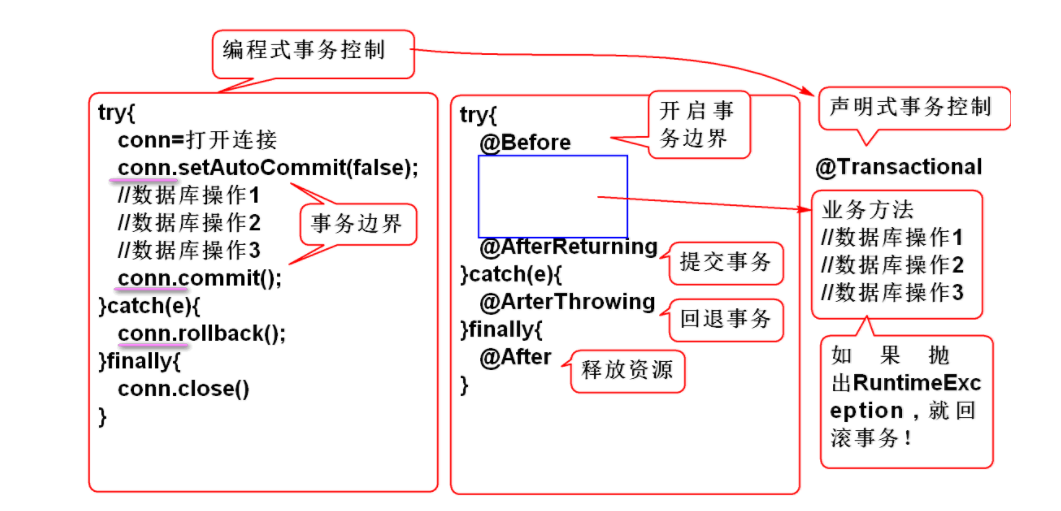 声明式事务处理, 底层是利用AOP实现的, 只需要简单配置即可使用.