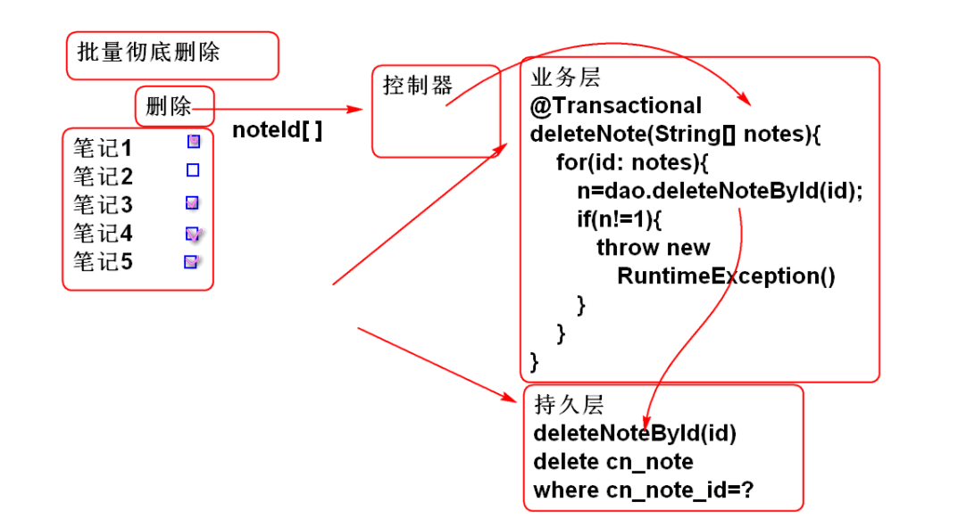 @Transactional public int deleteNotes(String... noteIds) throws NoteNotFoundException { for(String id: noteIds){ int n=noteDao.deleteNoteById(id); if(n!=1){ throw new NoteNotFoundException("ID错误"); } } return noteIds.length; }抛出异常 NoteNotFoundException 时候会触发Spring事务回滚操作.