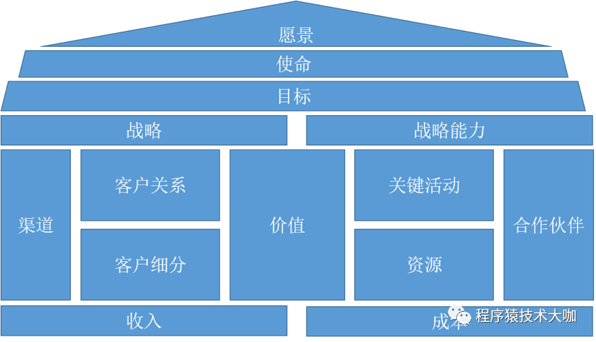 居中的是价值定位,企业为什么类型的客户提供什么类型的服务就是企业的价值定位,方块左右两边描述的其实就是这个含义,企业的价值定位是否准确、可持续,也就是看左边的活动产生的收入是否能覆盖右侧的活动带来的成本,如果是,企业就能够长期发展,如果否,企业就需要重新思考价值定位了,而这种反思很可能带来“屋顶”的变化。