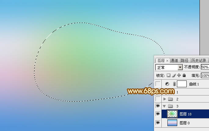 2、新建一个图层,用套索工具拉出下图所示的选区,羽化120个像素后填充淡绿色:#48D981,确定后把图层不透明度改为:50%,效果如下图。