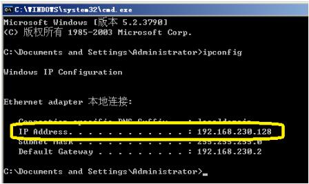 首先在虚拟机中,通过ipconfig得知虚拟机win2003的IP地址。