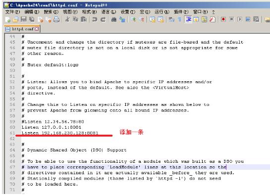 然后,防火墙弄完了,还要去弄Apache的配置文件conf/httpd.conf监听这个IP与端口,也就是让Apache允许这个IP与端口访问,在60行左右的位置添加一条,当时,我就忘记弄这个,搞了很久: