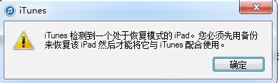 第三步、当看到屏幕黑屏时,请松开电源键,继续按住主屏 Home 键,直到电脑端的 iTunes 出现检测到一个处于恢复模式的 iPad;