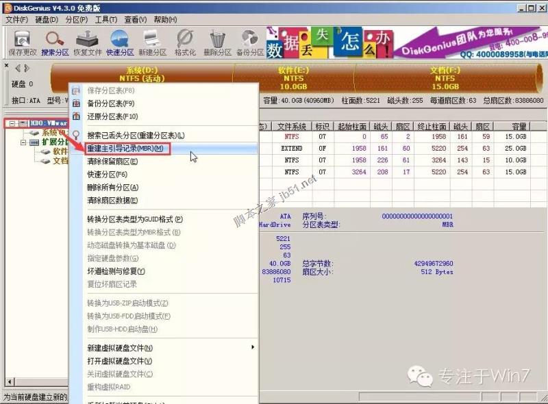 * 顺便说一下重建主引导记录(即重建MBR)操作,也是在这里选择硬盘,然后右键选择“重建主引导记录(MBR)”即可。