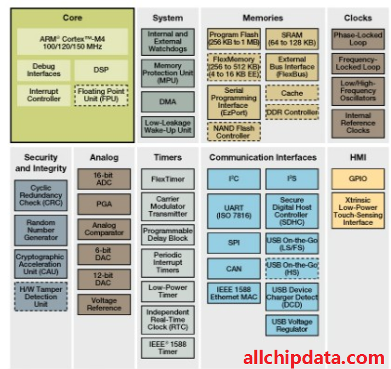 - ARM Cortex-M4内核提供1.25 DMIPS / MHz的DSP指令(浮点单元在kinetis系列可用).
