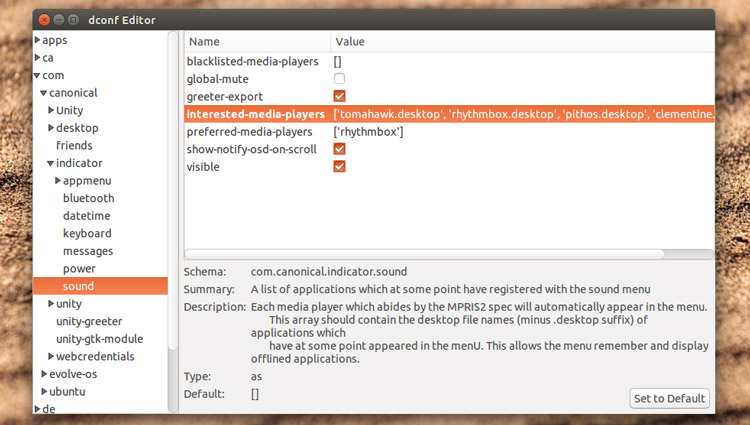 使用右侧菜单栏,你需要从导航到 com > canonical > indicator > sound.下面的面板将会出现。