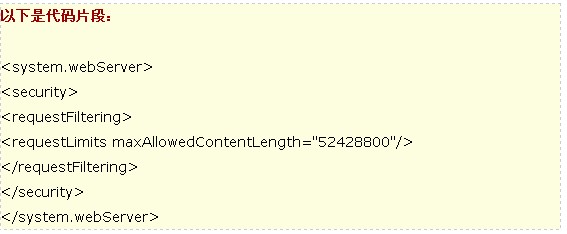 修改WebApplication的web.config,在的末尾增加允许最大的内容长度设置。
