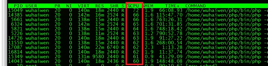 今天下午又发现系统负载很高,于是上去看了一下,发现一大坨PHP进程没有退出,占用了很多CPU,如图: