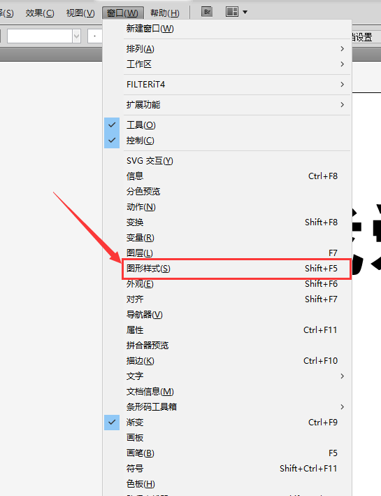 2、接着,点击菜单 “窗口” 弹出下拉菜单,在下拉菜单中找到“图形样式”菜单并点击。或者也可以用快捷键调出样式:shift+f5。