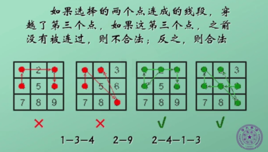 当下一状态手势点和当前状态点的距离 dis = 2 时,说明两点之间一定会存在第三点,此时需要判断中间点是否访问过,如果访问过说明合法。方可进入递归。