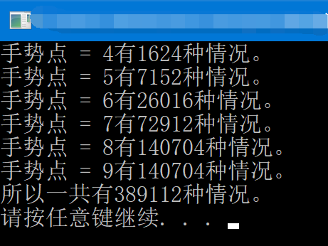 cout << "手势点 = " << n << "有" << count << "种情况。"<<endl;