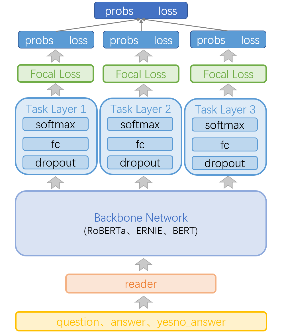 观点阅读理解模型主要基于多种预训练模型进行微调,其中涉及RoBERTa[2]、ERNIE[3]、BERT[4]的多个中文预训练模型,如:RoBERTa-wwm-large-ext、RoBERTa-large-pair、RoBERTa-zh-L、RoBERTa-wwm-ext、ERNIE1.0、BERT_zh_large等。