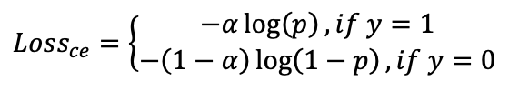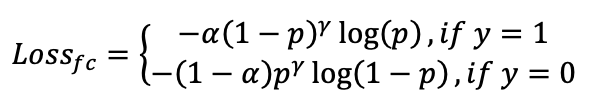 数据样本除了类别分布不均衡外,仍存在一定的难易样本不均衡的问题。尽管平衡了正负样本,但是对难以样本的平衡并没有帮助。易分样本通常较多,但是对模型的提升效果较小,因此模型应该适度的关注哪些难分样本。因此,引入focal loss损失函数[5]: