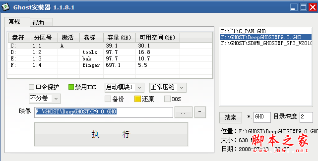 将ghost安装器打开,点击搜索按钮,将本机里的gho映像文件找到,会在右边列出来,选中一个gho文件后,同时将待安装的盘选好,